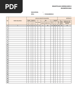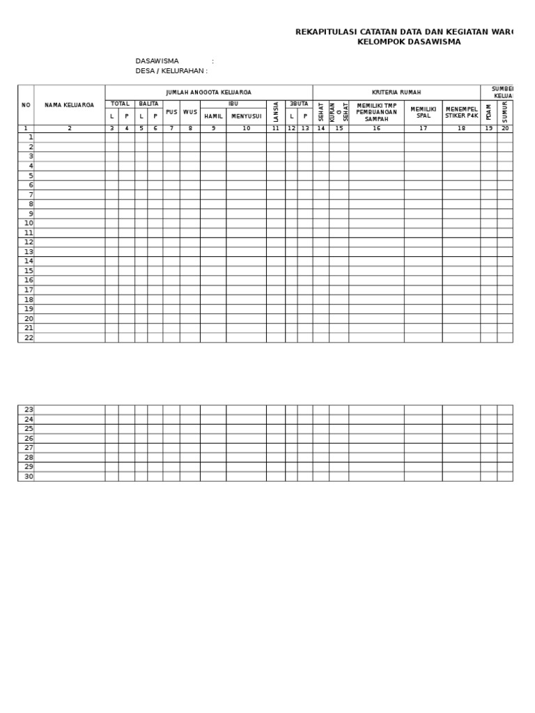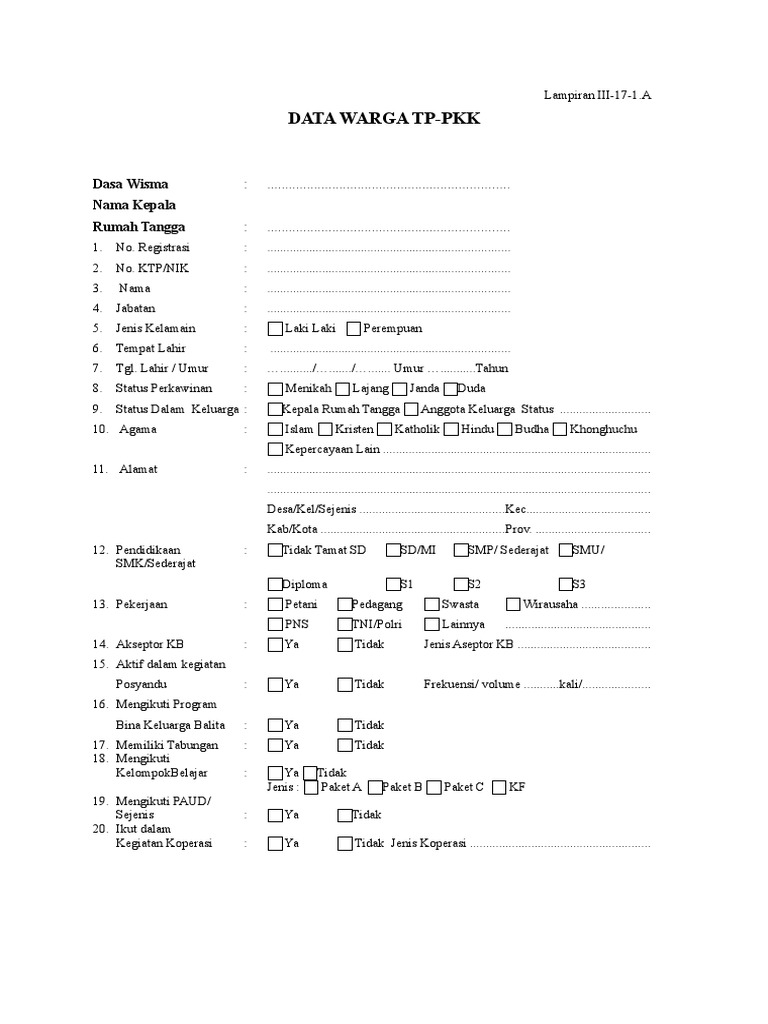 Pkk dasa wisma posyandu pejambon sumberrejo bojonegoro Tandai sebagai konten tidak pantas. Unduh sebagai xlsx, pdf, txt atau baca online dari scribd. 2.1.3 fungsi pokok dasawisma kelompok dasa wisma merupakan unit terkecil dari kelompok pkk yang terdiri dari 10 sampai 20 kepala keluarga (kk) dalam satu wilayah rukun tetangga (rt). Sep 22, 2020 · buku dasawisma pdf guru ilmu sosial arisan dasa wisma form dasa wisma laporan pkk rt010 rw05 ciganjur data keluarga dasawisma laporan pkk rt010 rw05 ciganjur pkk rt.