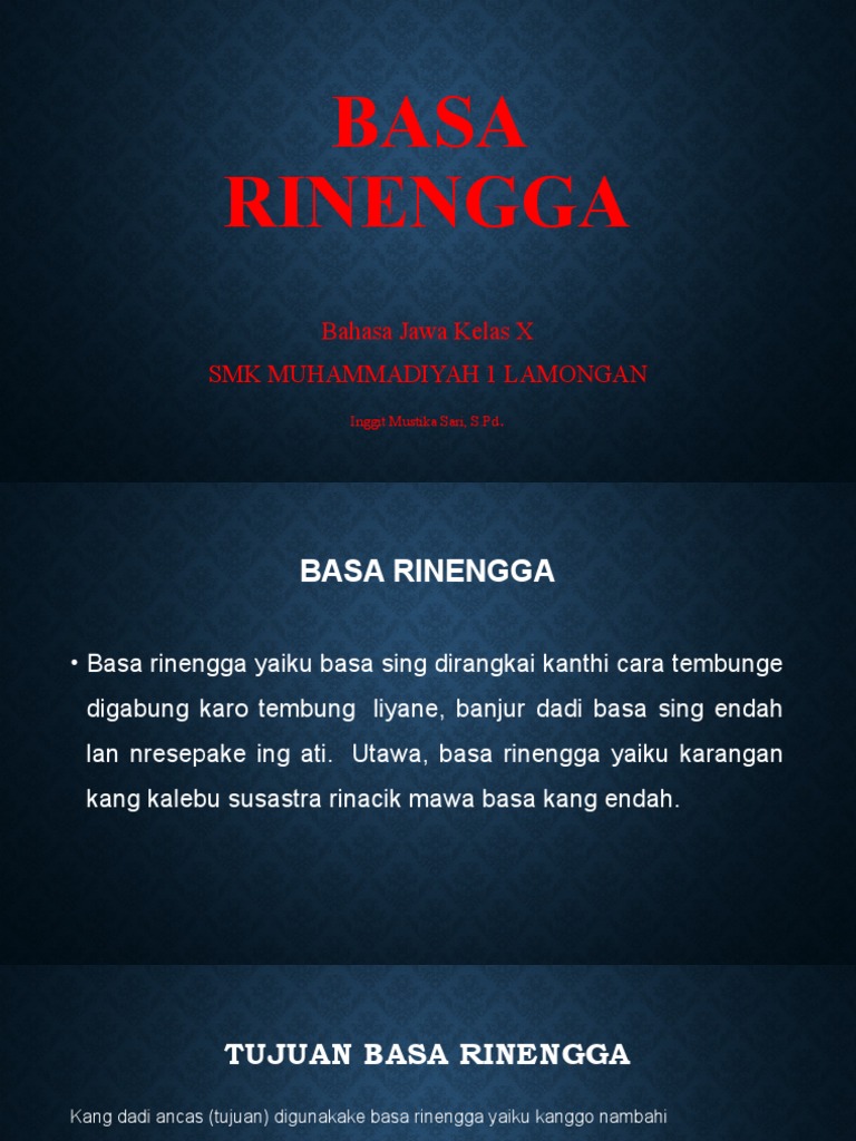 Jenis Basa Rinengga : Contoh Kalimat Yang Menggunakan Basa Rinengga Tugas Sekolah - Basa rinega biasane digawe ana ing acara pedhalangan, pranata cara.